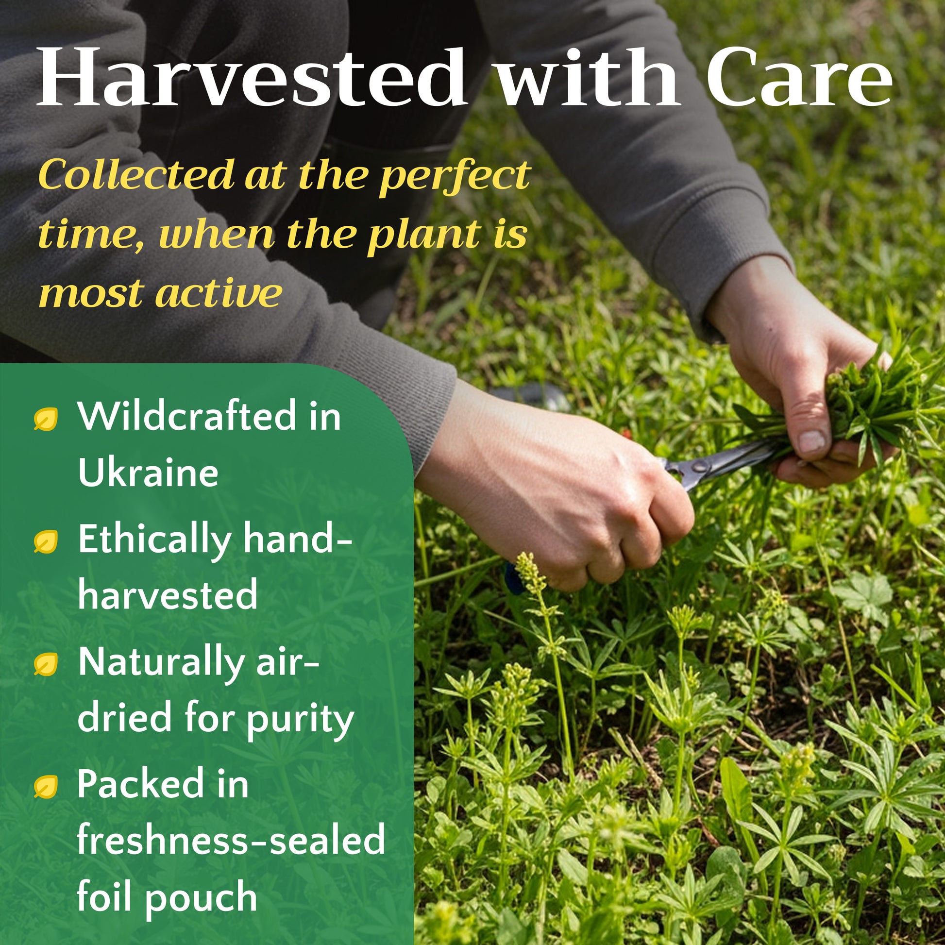 Wild-harvested cleavers from Eastern Europe, collected in early spring before flowering when the plant is young, tender, and at peak freshness. Air-dried quickly to maintain the bright green color and prevent oxidation.