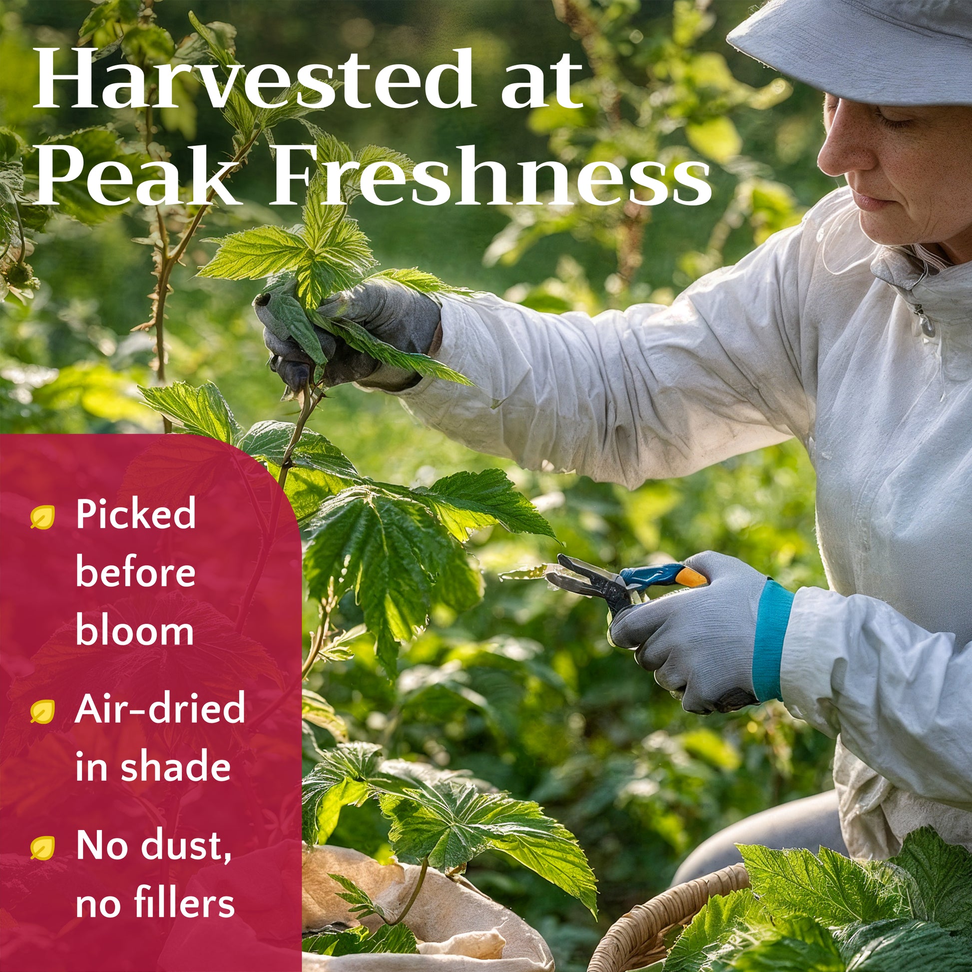 Wild-harvested raspberry leaves from Eastern Europe, collected in early summer when leaves are young and vibrant. Air-dried to preserve the natural green color and mild, pleasant flavor.