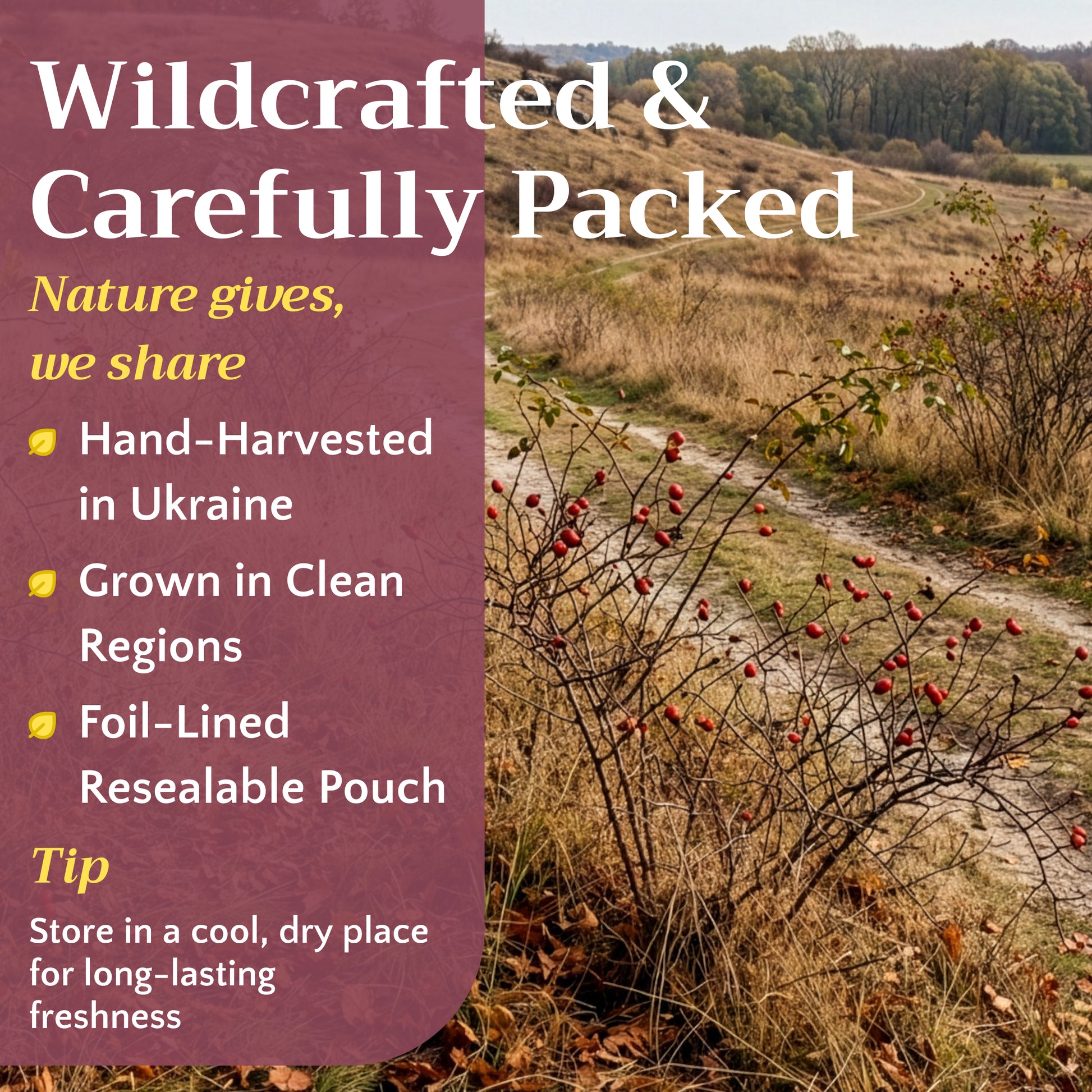 Wild-harvested rose hips from Eastern Europe, collected in late autumn after the first frost when the berries reach peak sweetness and deep red color. Low-temperature dried to preserve the natural tartness and vitamin content.